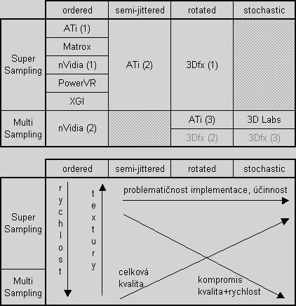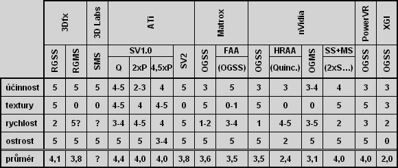 a 3D-Labs (3Dfx) Stochastic MultiSampling. Naopak pozici nejrychlejšího a nejméně kvalitního režimu obsadila nVidia