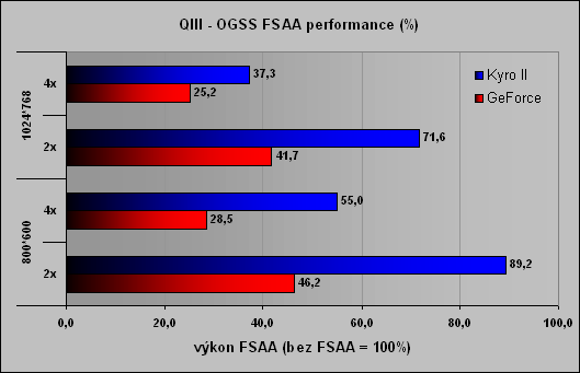 s enginem hry). Framerate bez FSAA by odpovídal 100(%). Graf tedy vyjadřuje dopad na výkon při režimech 2x a 4x