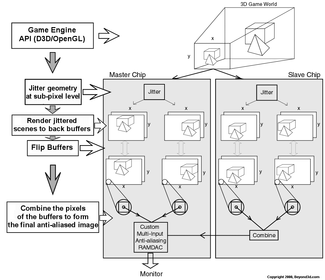 Pojďme se podívat jak režim funguje. První procesor od 3Dfx, který byl tohoto algoritmu schopen byl VSA-100. Jeden VSA-100